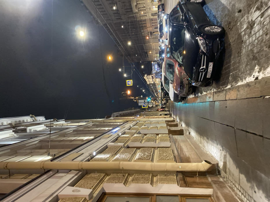 An urban night scene displays a row of parked cars, including a black Mercedes with license plate E025YT 147, lining a snow-dusted sidewalk. Above, streetlights illuminate the scene and a pedestrian crossing sign is visible. The lower portion of the frame shows the facade of a building with windows and textured wall panels, along with a drainpipe. The sky is dark, suggesting it is nighttime.