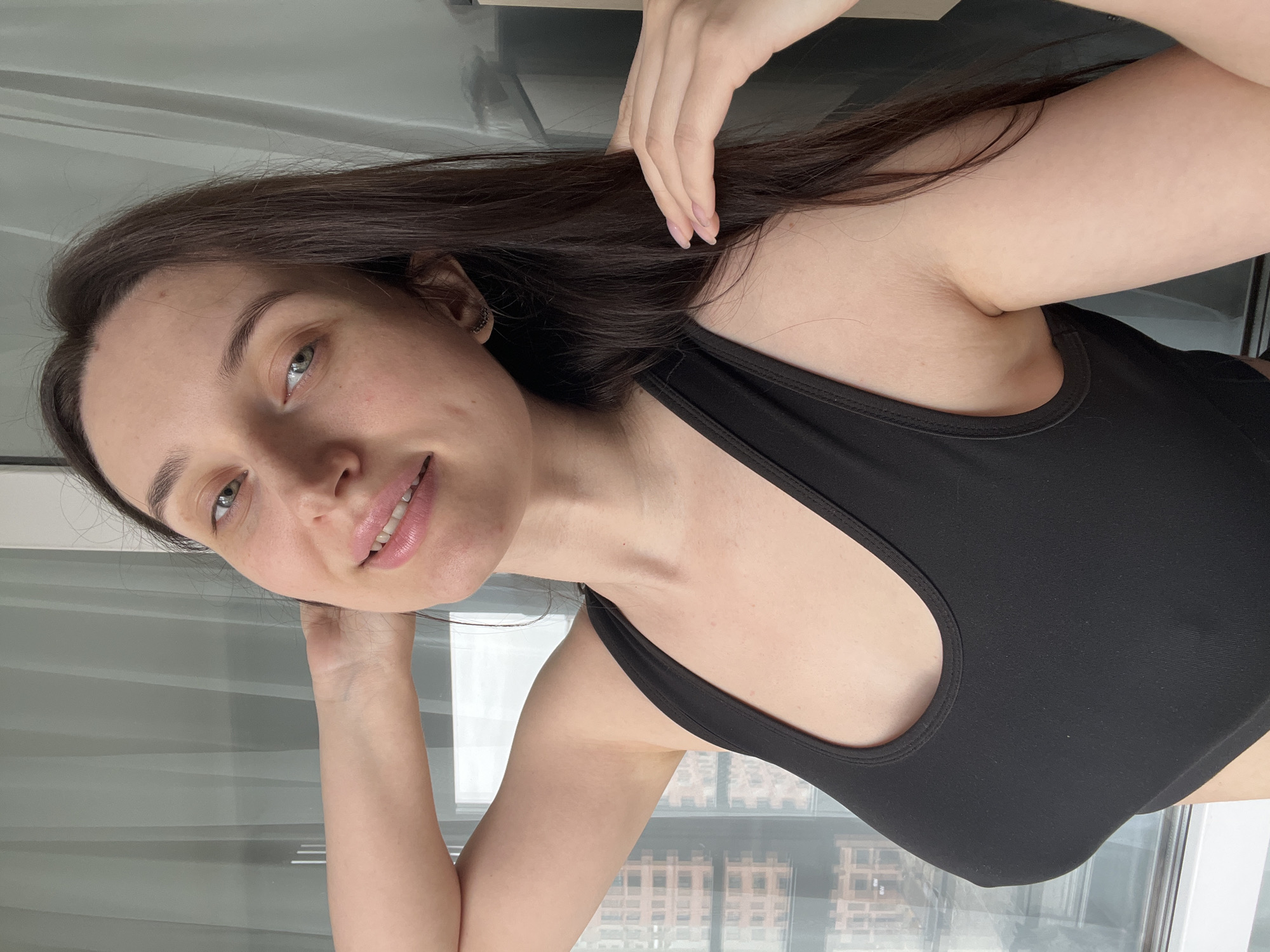 A fair-skinned woman with long, dark hair stands indoors in front of a window overlooking a city. The woman is wearing a black tank top and is smiling at the camera. The window has a semi-transparent covering allowing the buildings in the city of Tyumen, Russia, to be partially visible. She is holding her hair with her right hand.