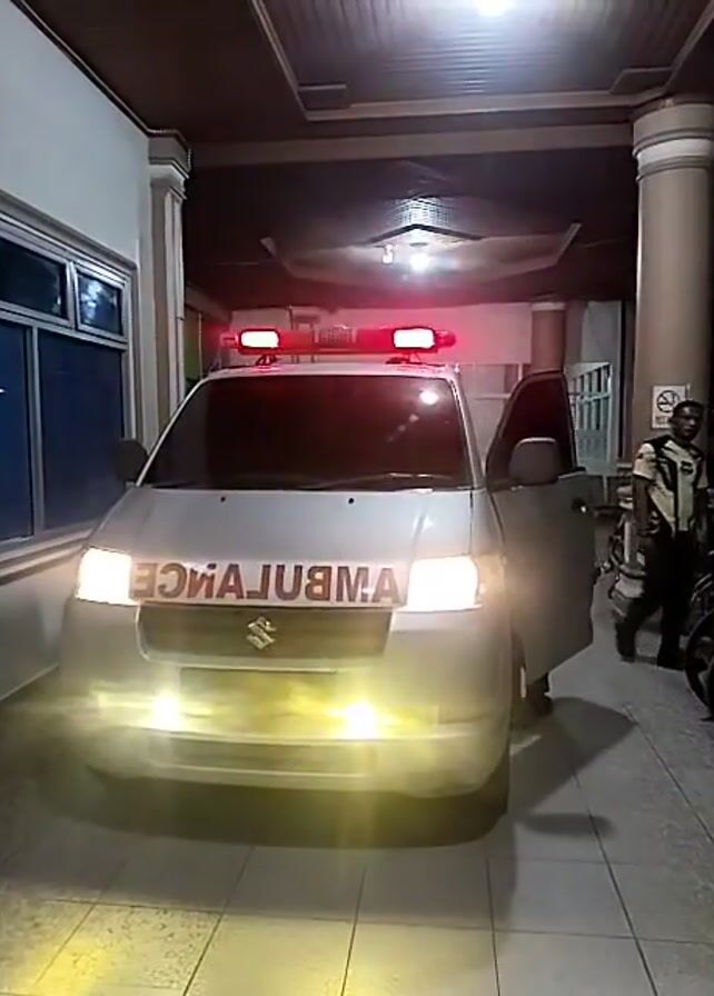 A silver Suzuki ambulance is parked outside, with its front-facing lights and emergency lights activated