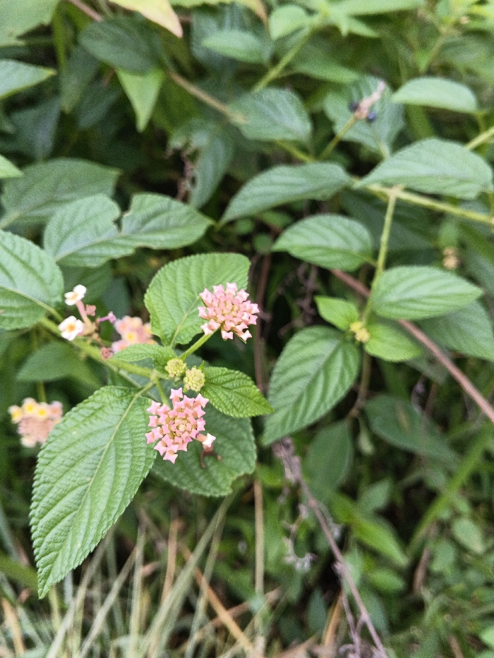 The image displays a close-up, shallow-depth-of-field view of a flowering plant, identified as Lantana camara. The plant features multiple clusters of small, tubular flowers, predominantly light pink at their outer edges and transitioning to a lighter pink or yellowish-white towards their centers. The leaves are dark green, ovate with serrated margins, and exhibit a textured surface with visible venation. Surrounding the main subject, a dense array of various green foliage forms a blurred background and partially visible foreground, with some dry, lighter-colored grass blades at the very bottom. A small, dark-bodied insect is discernible on a leaf in the upper right quadrant of the frame. The scene is illuminated by natural, diffused light. This botanical environment is consistent with a park, garden, or natural green space within the city of Chengdu, China.