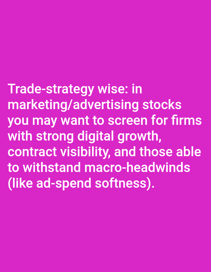 The image displays white text on a solid magenta background. The text reads: "Trade-strategy wise: in marketing/advertising stocks you may want to screen for firms with strong digital growth, contract visibility, and those able to withstand macro-headwinds (like ad-spend softness)." There are no people, objects, actions, or environmental cues depicted that could indicate a physical location within the city of Jos, Nigeria, or any other geographical area.