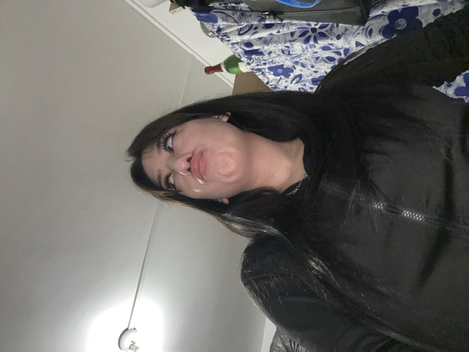 A woman with long, straight, black hair is angled downward in the frame. Her lips are pursed and covered in a white substance, and a matching substance is smeared beneath her nose. She wears heavy eyeliner and a black jacket. The background features a white ceiling with a light fixture, a floral-patterned cloth, and what appears to be a wine bottle. The overall composition suggests a selfie taken from an unconventional angle.