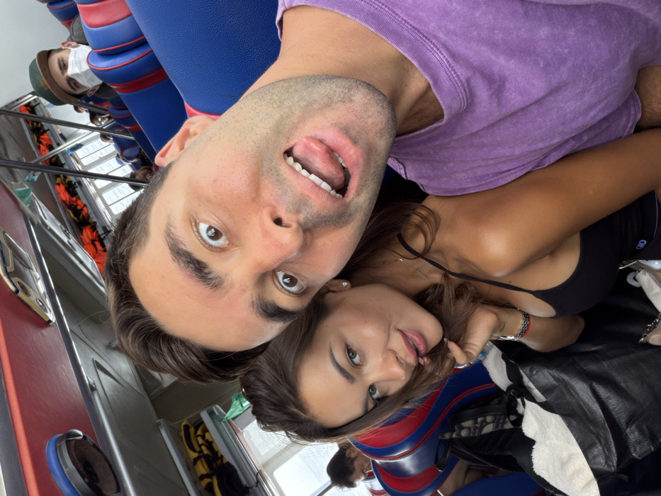 A selfie taken aboard a boat. A man with short brown hair wears a purple t-shirt and sticks out his tongue. A woman with brown hair and a black tank top smiles beside him. Other passengers are visible in the background, including one wearing a face mask and hat. The boat's interior features blue and red striped seating. Life vests can be seen stowed away in the vessel. The photograph is slightly rotated.