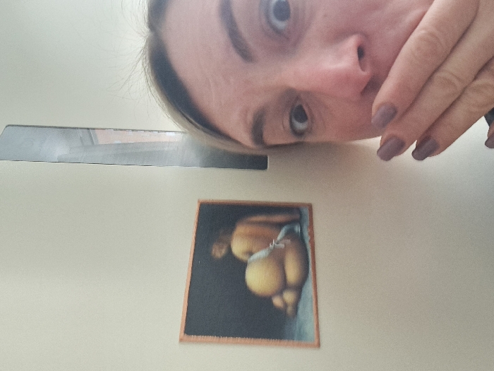 This image depicts an indoor scene in Меткомелино, Russia. The right portion of the frame is occupied by the partial face of a light-skinned female individual, visible from approximately the nose upwards. Her eyes are wide open and directed towards the camera. Her right hand, featuring fingernails painted a muted purplish-gray, is positioned over her mouth. Light-colored hair is visible at the top of her head. To the left, a rectangular framed painting is affixed to a plain, light-colored wall. The painting illustrates a nude human figure, viewed from behind, in a reclining or crouching posture, with prominent buttocks and a light-colored ribbon or cloth tied around the lower back, set against a dark background. A narrow, vertical reflective surface, possibly a mirror or the edge of a window frame, is visible on the wall to the left of the individual's face.