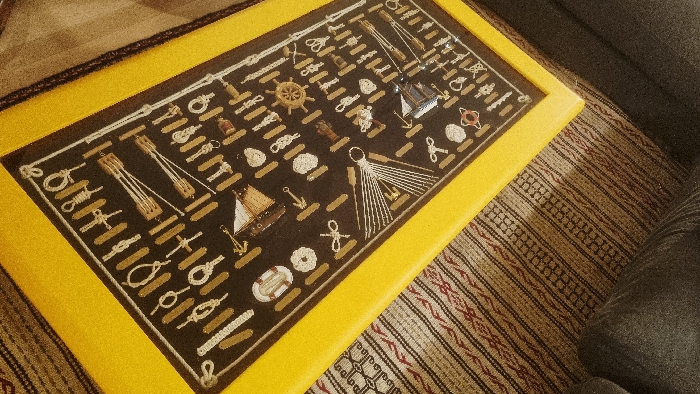 A rectangular framed display, oriented horizontally with a bright yellow border, is depicted from an elevated, oblique angle. The display's dark interior background showcases an organized collection of miniature nautical items arranged in rows and columns. These include numerous examples of white and off-white rope knots, miniature wooden block-and-tackle systems, a small model sailboat with a brown hull and white sails, a ship's wheel, several anchors, and a miniature lifebuoy. The display is positioned on a patterned rug featuring geometric motifs and stripes in shades of brown, beige, and dark red. A section of dark, possibly upholstered, furniture is visible on the right edge of the frame. No individuals are present, and no actions or interactions are occurring. The specific location in the city of Stockholm, Sweden, is indeterminable from the visual evidence.