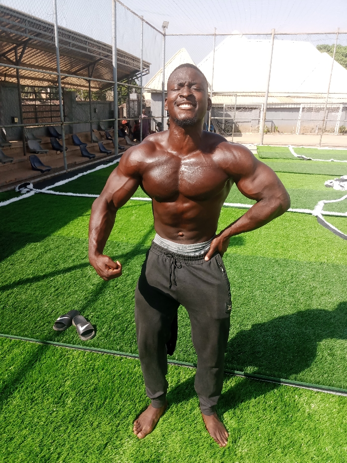 A muscular Black male stands shirtless and barefoot on artificial green turf, posing with his left arm flexed and his right hand on his hip. He wears black drawstring sweatpants with a grey waistband visible. Sweat beads are present on his chest and forehead, and he exhibits a wide, squinting smile. A pair of black Nike slides rests on the turf to his immediate left. The scene is an outdoor sports facility in Akwanga, Nigeria, characterized by bright daylight casting shadows behind the subject. In the background, to the left, a covered spectator stand with multiple rows of empty dark-colored seats is visible behind a wire mesh fence. To the right, a building with a distinctive white gabled roof is also enclosed by wire mesh fencing. The artificial turf features white painted field markings.