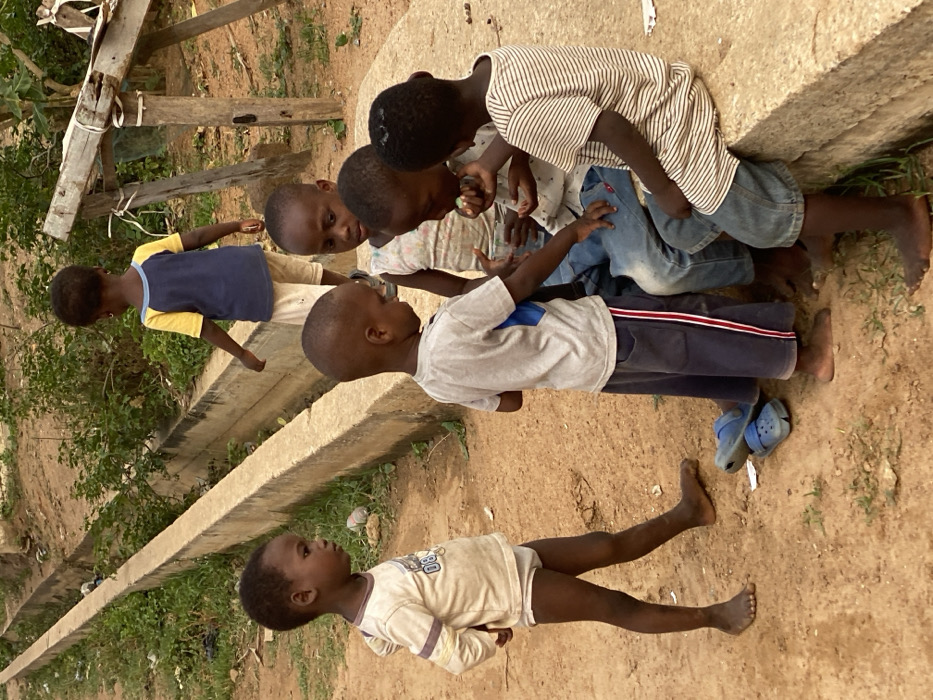 Five young children are outdoors. One child wears a blue and yellow shirt and stands next to a concrete ledge. Four children, one barefoot, are closer together; one wears a striped shirt and jeans, and another has blue Crocs. A child in a gray shirt with blue striped pants reaches out, and the last child is barefoot in a white shirt, lying on the ground. There are plants and some structures nearby.