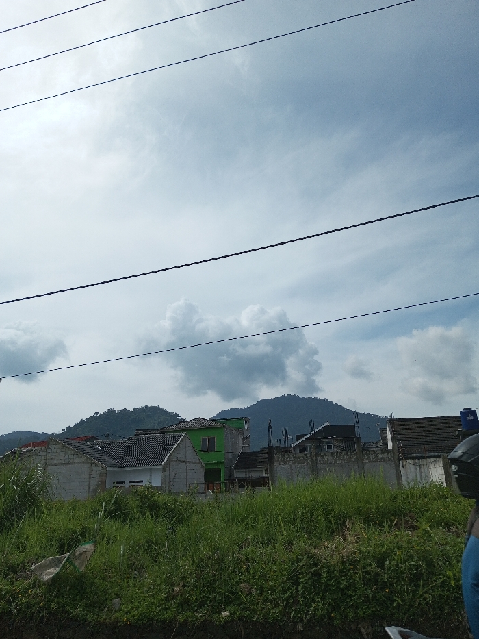 The scene is an exterior view in Kandenuwara, Sri Lanka. The foreground displays dense, unkempt green vegetation. On the far right, a dark grey helmet and a portion of a person in a light blue garment are visible, suggesting an observer on a vehicle. The midground features a row of residential buildings: a prominent two-story house with a bright green facade and a dark grey tiled roof is centrally located, flanked by structures exhibiting unpainted concrete walls, some in various stages of construction with exposed rebar. A low concrete wall runs horizontally across the midground. The background is dominated by dark green, tree-covered mountains beneath an overcast sky interspersed with white and grey cumulus clouds. Four dark, thin utility lines stretch horizontally across the upper portion of the frame.
