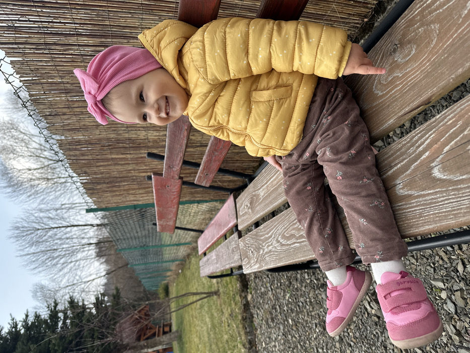 The image depicts a young child, appearing to be a toddler, seated on a weathered wooden park bench with black metal supports, located within the city of Wisła, Poland. The child wears a pink ribbed turban-style hat with a bow, a yellow quilted puffer jacket with white polka dots, dark brown corduroy-textured pants featuring small floral patterns, white socks, and pink athletic shoes with hook-and-loop fasteners. The child is smiling broadly, with the head turned towards the right, and the right index finger is pointed downwards towards the bench seat. Behind the bench, a green chain-link fence runs horizontally, backed by a light brown woven bamboo or reed fence panel. The background to the left includes a grassy area with scattered grey gravel, a wooden gazebo with a dark roof, and a tall evergreen tree. Beyond the fences, numerous deciduous trees with bare branches are visible against an overcast sky, indicating a late winter or early spring outdoor setting.