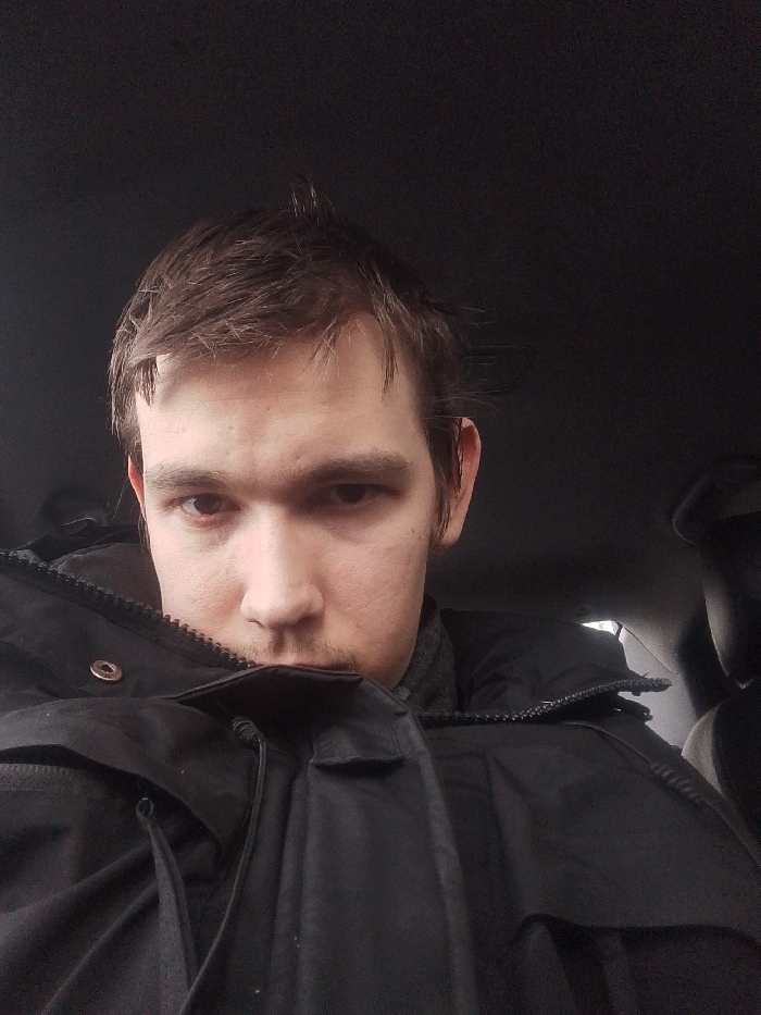 An adult male with light skin and disheveled dark brown hair, exhibiting a receding hairline, is depicted in a close-up, chest-up shot. He has stubble or a thin mustache above his lip and a direct, neutral gaze. His eyes appear somewhat heavy-lidded. He wears a black, insulated winter jacket, partially unzipped, revealing a grey garment underneath, possibly a scarf or an inner layer. The jacket features a visible bronze-colored snap closure and a drawstring near the collar. The background is dark and appears to be the interior of a vehicle, consistent with a car's headliner and a glimpse of a dark seat or headrest on the right side. The ambient lighting is subdued. No specific landmarks or unique environmental features are present to determine an exact location within Saint Petersburg, Russia. The individual is positioned centrally, facing the camera directly, suggesting a selfie or posed portrait.