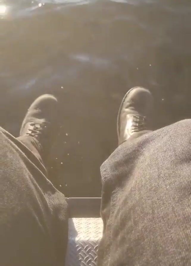 A person is sitting on a boat, their legs and feet visible, wearing grey pants and work boots. The camera pans up to show a large body of water, possibly a river or lake, with sunlight reflecting on the surface. In the distance, buildings and a bridge are visible against the horizon, with a bright sun shining in the sky. The water is gently rippling, suggesting a calm day.