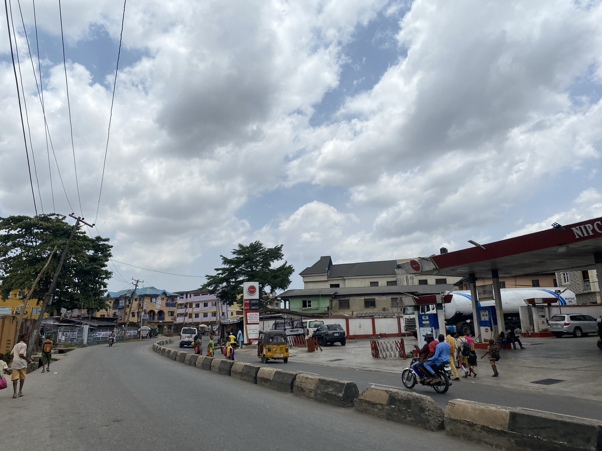 An overhead view captures a bustling street scene in Alagba, Nigeria, under a partially cloudy sky with patches of blue. The asphalt road, which curves slightly to the left, is bordered by low concrete barriers on the right. On the immediate left, a pedestrian in a light-colored shirt and shorts, holding a pink bag, walks away from the viewer. Another individual with a backpack is visible behind them. A large green-leafed tree and a wooden utility pole with multiple overhead wires are prominent on this side. Further down the street, multi-story buildings with varied facades (yellow, blue, orange, purple) line the road, suggesting commercial and residential use. A small motorcycle with a single rider is visible in the distance on the left lane. On the right side of the road, the primary feature is a NIPCO fuel station with a prominent red canopy. Fuel price signs display "PMS 173.50" and "AGO 183.00". Inside the station, a large white tanker truck with "MULSUF OIL" and blue stripes is visible, alongside multiple fuel pumps. A silver SUV is parked behind the tanker. A blue motorcycle carrying two passengers is on the road near the station's entrance, passing a group of approximately five pedestrians. A yellow motorized tricycle (keke napep) is also visible on the road, heading toward the viewer. Several individuals are gathered within the filling station area, some standing, others seated on low structures. Buildings behind the fuel station are green and grey.