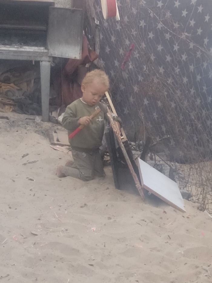The image depicts a young child kneeling on sandy ground in Al-Mawasi, Unknown. The child has light, curly hair and is wearing an olive green long-sleeved shirt with a light emblem on the chest, and olive green pants. The child is barefoot. Both hands hold a red-handled tool, resembling a hammer, which is positioned against a piece of dark wood or debris. The immediate ground is composed of light-colored sand with minor scattered debris. In the left background, a metal structure, possibly an oven or stove, with a dark interior and a lighter metal panel, is visible. Behind the child and extending to the right, a dark fabric patterned with white stars, resembling a flag, is erected vertically. Various wooden planks and miscellaneous debris are leaned against this star-patterned fabric. To the right of the child, a white rectangular board rests angled on the sand. Sparse, dry vegetation is present in the right background. The scene suggests an outdoor, makeshift environment.