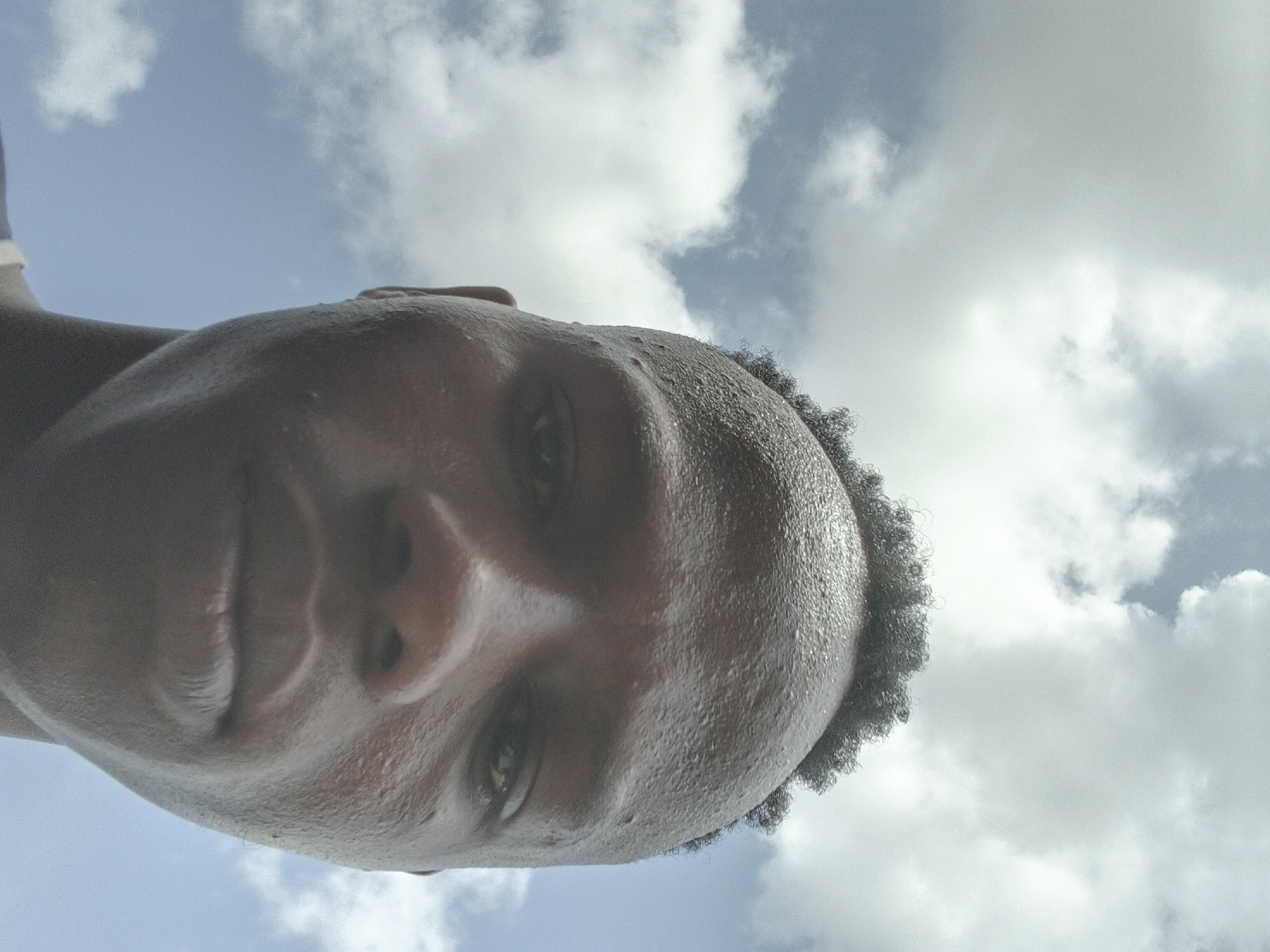 A low-angle, close-up portrait captures the head and upper shoulders of a young adult male in Lekki, Nigeria. The subject has dark skin, short, tightly curled black hair, and a neutral facial expression, looking directly into the camera. His forehead and face exhibit visible moisture or perspiration. A white strap, consistent with a garment, is partially visible on his upper right shoulder. The background consists of a bright blue sky with scattered white cumulus clouds, indicating an outdoor, daytime setting. No other individuals or significant objects are present in the frame.