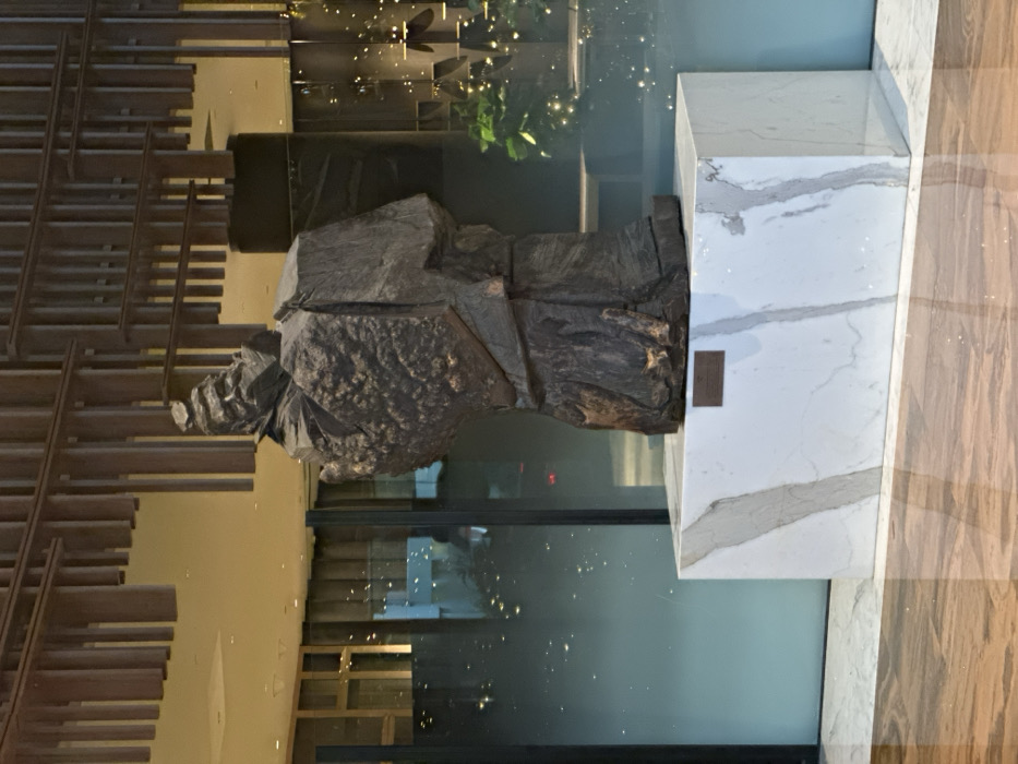 A dark bronze, stylized sculpture of a bearded male figure, rendered with angular planes and textured surfaces, stands prominently on a rectangular white marble pedestal featuring distinct grey veining. A small, dark bronze plaque is affixed to the front of the pedestal. The sculpture is positioned on a highly polished, reflective floor with a reddish-brown, wood-grain pattern. Behind the sculpture, a large glass partition reflects ambient interior lighting, including diffuse patterns resembling string lights on the right, and indistinct external urban lights on the left. Overhead, a complex ceiling structure composed of numerous parallel wooden slats is visible. This scene is located within the lobby of The Fullerton Hotel Singapore, 1 Fullerton Square, Singapore.