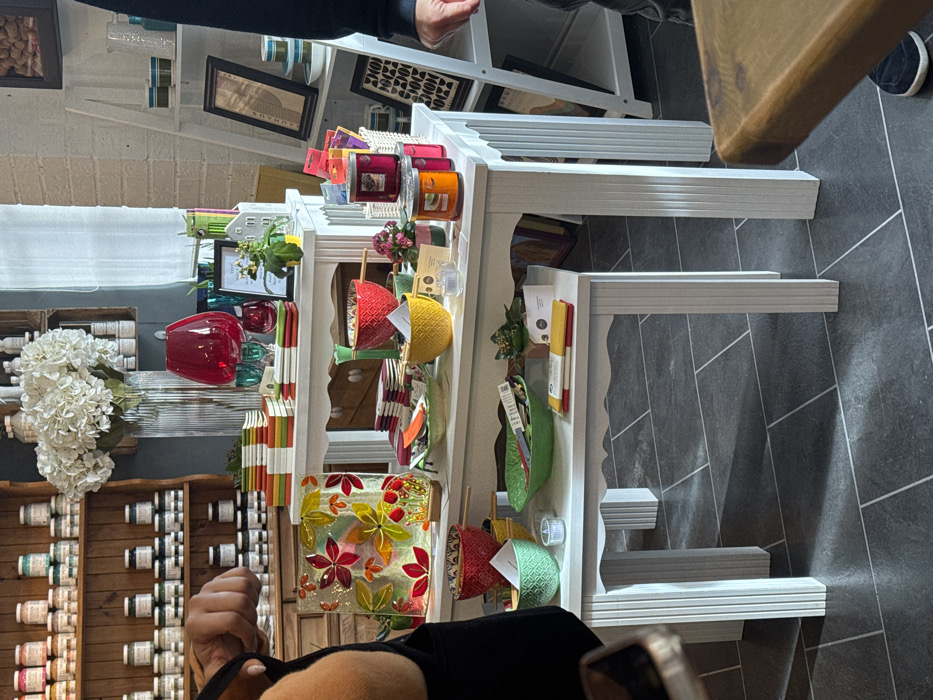 This image presents a forensic view of a retail interior located in Hornsea, United Kingdom. In the central foreground, two white display tables with fluted legs are arranged, with a taller table positioned behind a shorter one. The upper display table exhibits a square decorative glass panel featuring multicolored botanical designs, stacks of brightly colored notebooks, a tall clear glass vase with white artificial hydrangeas, a red glass vase, various patterned ceramic bowls (red, yellow), and multiple jarred candles (pink, orange). The lower table displays additional patterned ceramic bowls (mint green, red), a green leaf-shaped bowl, and small tea light holders. To the far left, the partial view of an individual's left arm and torso is visible, clad in a dark garment, with a blurred handheld device near their waist. A wooden shelving unit in the left background is fully stocked with numerous small, uniformly sized jars, likely containing paints or craft supplies. In the right background, a white ladder-style shelving unit holds framed artwork (including one labeled "BAUHAUS") and assorted decorative bowls. A second individual's lower right leg and foot, wearing dark trousers and a navy shoe, are visible on the far right. The floor is composed of large dark grey square tiles with lighter grout lines. A window with a sheer white curtain is visible on the upper right wall. The scene is well-lit, casting distinct shadows on the tiled floor.