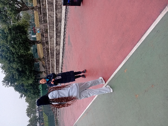 Two figures stand on a red and green tennis court, divided by a white line. One figure, closer to the viewer, is clad in gray sweatpants and a gray hoodie with long braided hair. The other figure, positioned further back, wears a dark blue coat. Green foliage, trees, and a concrete staircase are visible in the background. The sky appears overcast.