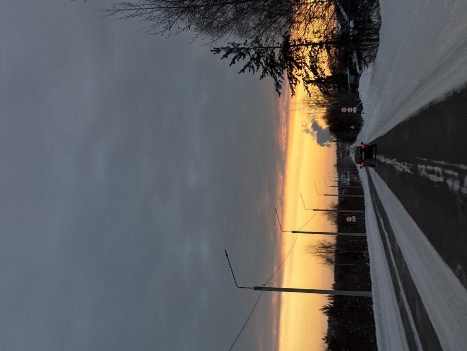 An asphalt road stretches into the distance, flanked by snow-covered terrain. Streetlights line the right side. A car moves along the road, its headlights illuminated. Above, the sky is divided between a dark, cloudy expanse and a vibrant golden sunset. Trees are visible along the edges, silhouetted against the bright sky.