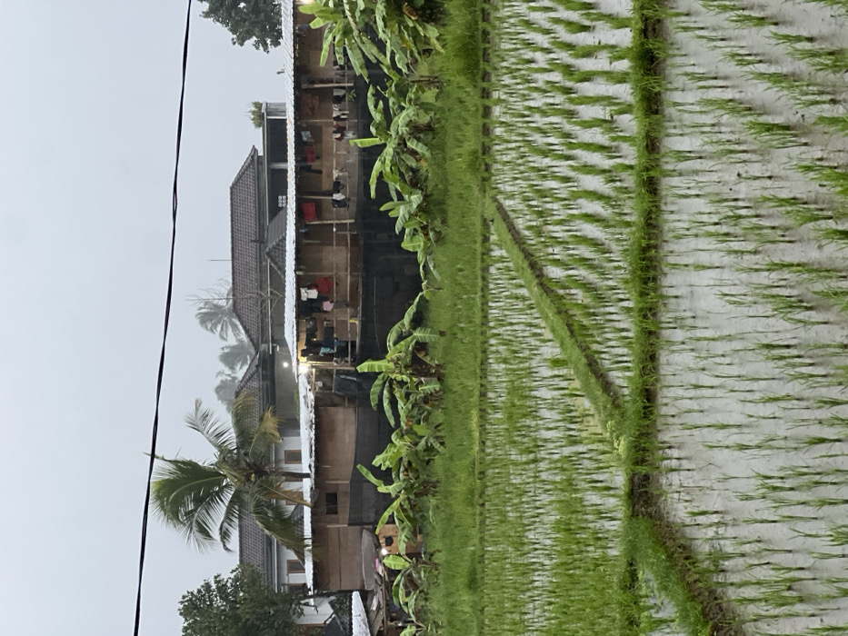 The image displays a rural scene in Ubud, Indonesia, under an overcast, light gray sky