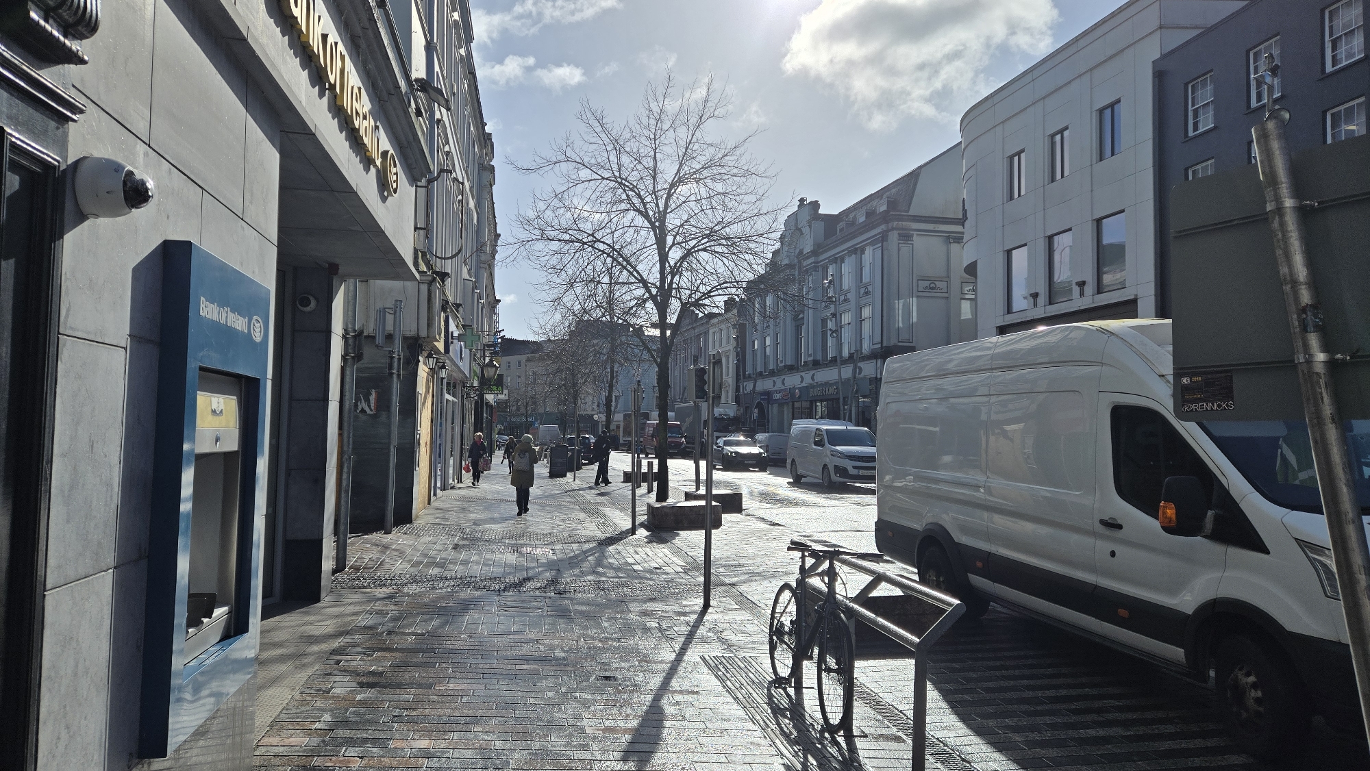 This image depicts a sunny day on St. Patrick's Street in Cork, Ireland, looking northeast along the pedestrianized shopping thoroughfare. The scene captures a commercial street lined with multi-story buildings. On the left, the Bank of Ireland building, featuring a gray facade and a prominent blue ATM/deposit machine, dominates the immediate foreground. A white dome-shaped CCTV camera is mounted above the ATM. The footpath, paved with light-colored bricks, appears wet and reflective in areas, suggesting recent precipitation or cleaning. Several pedestrians are visible walking away from the camera along the footpath. One individual in a light-colored coat is in the mid-ground, followed by another person in dark attire carrying a red bag. Bare-branched deciduous trees, casting long shadows to the left, are spaced along the center of the footpath, delineated by metal bollards and tree grates. On the right side of the street, a large white cargo van, with "RENNICKS" visible near its front wheel, is parked or slowly moving on the wet road surface, partially obscuring the buildings behind it. A black bicycle is parked upright in a metal bicycle rack in the lower right foreground, casting a strong shadow. Further down the street, other vehicles are visible on the road. The buildings on the right feature varied architectural styles, including a structure with a visible "Burger King" sign in the mid-distance and one with a curved, light-colored facade. The sky above is partly cloudy, with bright sunlight emanating from the upper right, creating sharp contrasts and long shadows across the street.