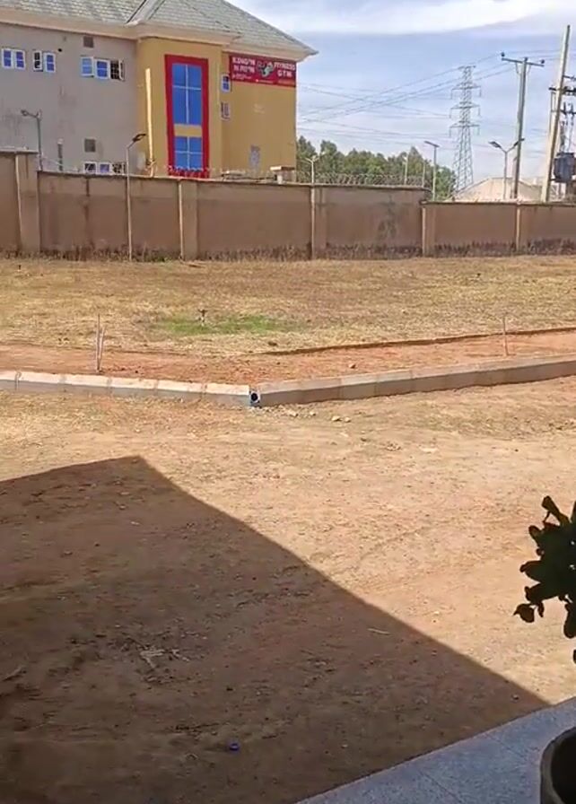 n outdoor view from under some sort of roof or portico. In the foreground is a potted plant. Beyond that is a dirt yard, edged by a cement curb. In the background is a building with "KINGDOM FITNESS GYM" on it, behind a wall. Power lines are visible. The weather is sunny. There are no people visible.
