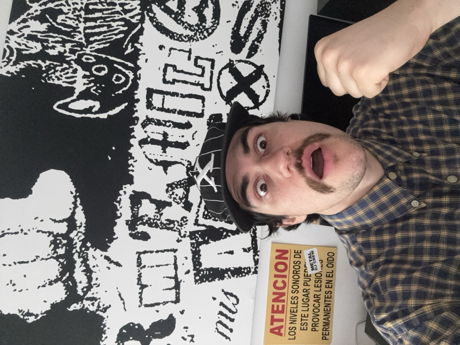 The image captures a male individual indoors, located in Buenos Aires, Argentina. The subject, a man with dark hair and a prominent handlebar mustache, wears a pinstriped baseball cap featuring a white 'X' logo and a blue and yellow plaid button-up shirt. He presents a wide-eyed, open-mouthed expression, with his left hand clenched into a fist. Behind him, a white wall is adorned with large black and white stencil-style artwork depicting a raised fist, distressed text including "RAMILLETES," and a cartoonish animal face. To the upper left of the individual's head, a rectangular yellow sign with red Spanish text reads: "ATENCION / LOS NIVELES SONOROS DE ESTE LUGAR PUEDEN PROVOCAR LESIONES PERMANENTES EN EL OIDO" (ATTENTION / THE SOUND LEVELS IN THIS PLACE MAY CAUSE PERMANENT EAR DAMAGE). A smaller sticker labeled "METAL DJ CREW" is affixed to the bottom right of this sign. A dark, rectangular object, possibly an electronic device or speaker, is partially visible on the right side of the frame.