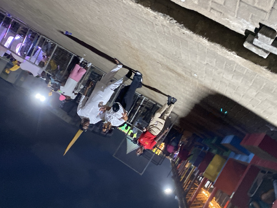 Outdoor nighttime scene with a group of people standing near a railing. Several individuals are casually dressed, while two are wearing white robes. A large yellow object is held by one person, pointing towards the sky. The background shows a dimly lit gathering of people and a structure with colorful panels. The ground appears to be paved.