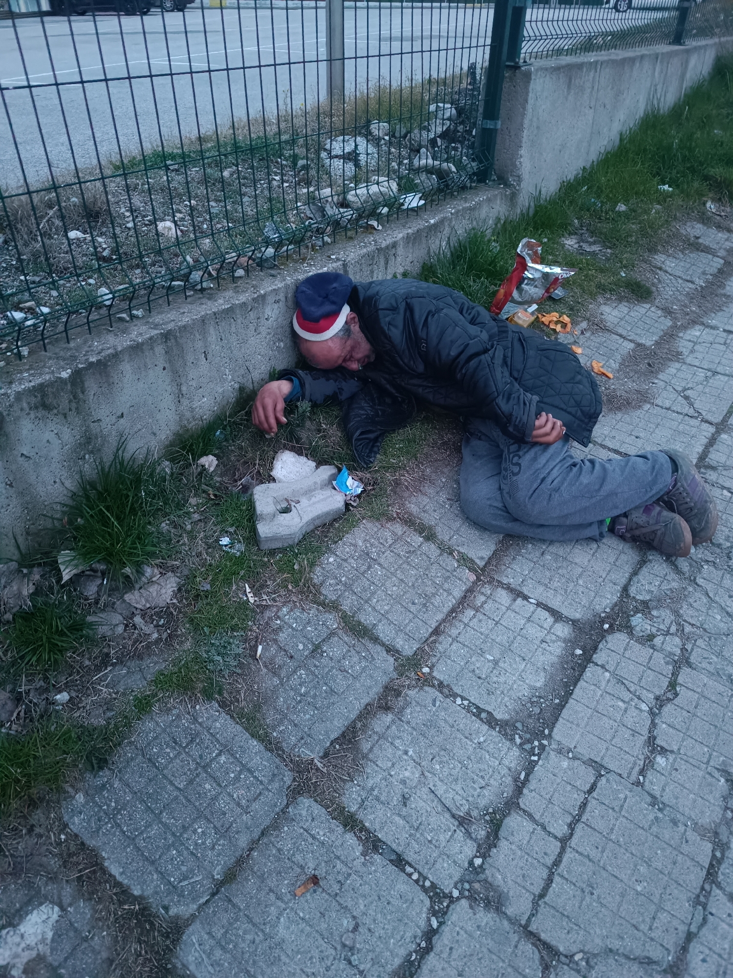 An adult male is observed lying on his left side on a concrete tiled sidewalk in Asenovgrad, Bulgaria. He is positioned against a concrete curb, adjacent to a patch of grass and dirt. The man is wearing a dark, quilted jacket, grey sweatpants with a visible "S" logo on the left thigh, and dark sneakers with purple accents. A navy blue cap with a red and white band is on his head. His eyes are closed, and his face is turned towards the curb and ground. Next to his head, on the grass, is an irregular-shaped concrete block and a small piece of crumpled blue and white material. Near his mid-section, a crumpled red and metallic snack bag, scattered orange-colored snack pieces, and a small, light-brown rectangular object are visible on the ground. The immediate area includes sparse grass, weeds, and debris. Behind the concrete curb, a dark green metal mesh fence runs parallel. Beyond the fence, a paved surface is visible, with a dark vehicle partially present in the upper left background. The sidewalk consists of grey, square-patterned paving stones, many showing cracks and weeds growing in the interstices. The lighting suggests ambient conditions, possibly dusk or dawn.