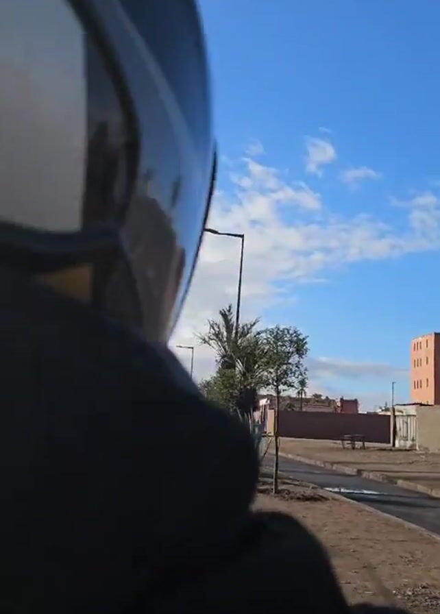 The video captures a street scene under a bright blue sky with scattered white clouds. Initially, the view is from a roadside with a sidewalk, featuring various plants and trees. A building stands further back. The camera angle then shifts, indicating the viewpoint is from a moving vehicle, likely a motorcycle or scooter. The camera points down the street. The frame of the hood of the vehicle is briefly visible, followed by a shot of a rearview mirror, the road, and the street with palm trees and other plants lining the side. Another person on a motorcycle is visible in the distance.