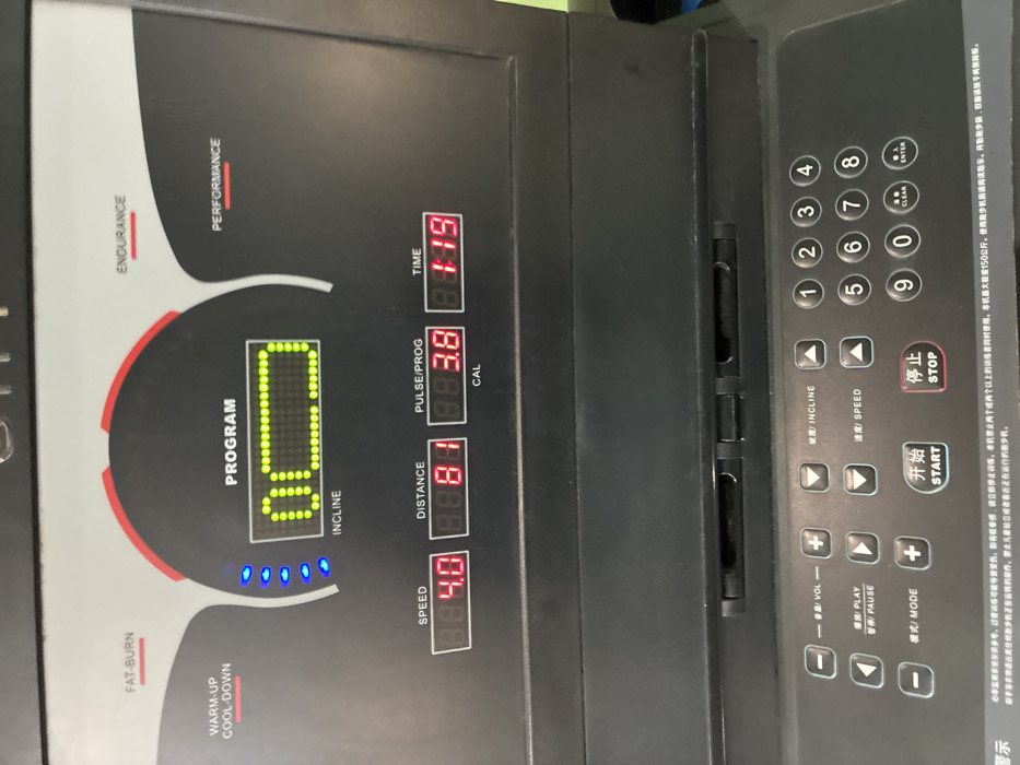 An overhead view captures the control panel of a black exercise machine, likely a treadmill, situated in an indoor setting. The upper section features a digital display with a dark background. A central circular area labeled "PROGRAM" displays "00" in green LED dots. To its left, two out of five vertical blue LED indicators are illuminated, corresponding to "INCLINE." Red LED readouts below show "SPEED 4.0," "DISTANCE 8.1," "PULSE/PROG 3.8," and "TIME 1:19." Text labels like "FAT-BURN," "WARM-UP COOL-DOWN," "ENDURANCE," and "PERFORMANCE" are visible across the top. Below the display, a horizontal black panel contains two recessed slots. The lower control area consists of numerous black buttons with white labels. These include volume controls ("VOL - +"), media playback buttons ("PLAY," "PAUSE," arrow keys), mode selection, dedicated incline and speed adjustment arrows, a circular green "START" button (labeled "开始" in Chinese), and a circular red "STOP" button (labeled "停止" in Chinese). To the right, a numerical keypad (0-9, CLEAR, ENTER) is present. A strip of fine print, primarily in Chinese characters, runs along the very bottom of the panel. No people are visible. The machine appears to be active or recently used, displaying current metrics. The location is Unknown, Unknown.