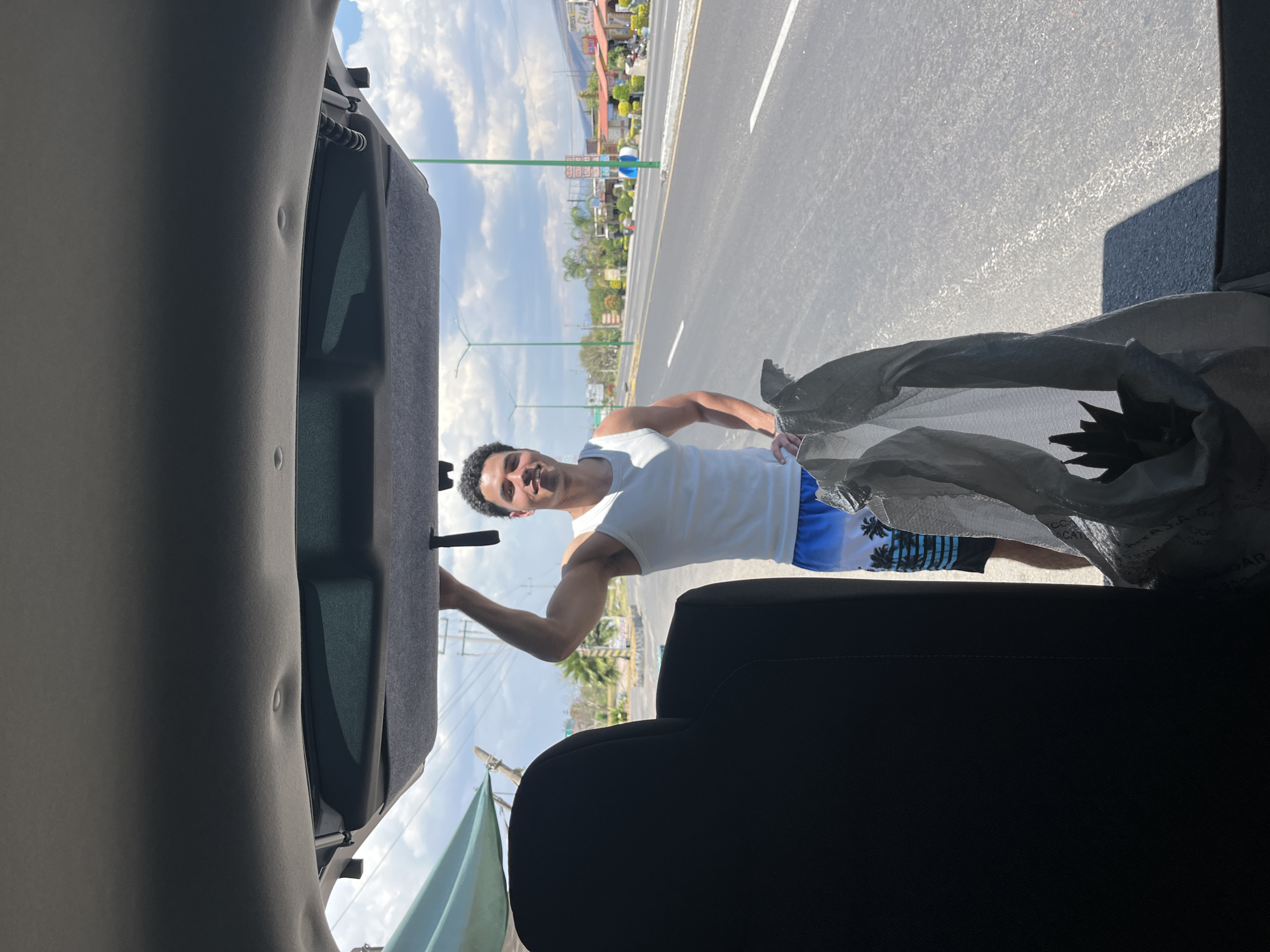 A person is putting a gray, plastic bag containing a pineapple into the open hatch of a vehicle on the side of a paved road in San Juan Huiluco, Mexico. The person is facing towards the vehicle, wearing a white tank top and blue shorts with a tree pattern. The hatchback interior is visible. The road has a median and streetlights, and buildings are seen in the background. The sky is partly cloudy.