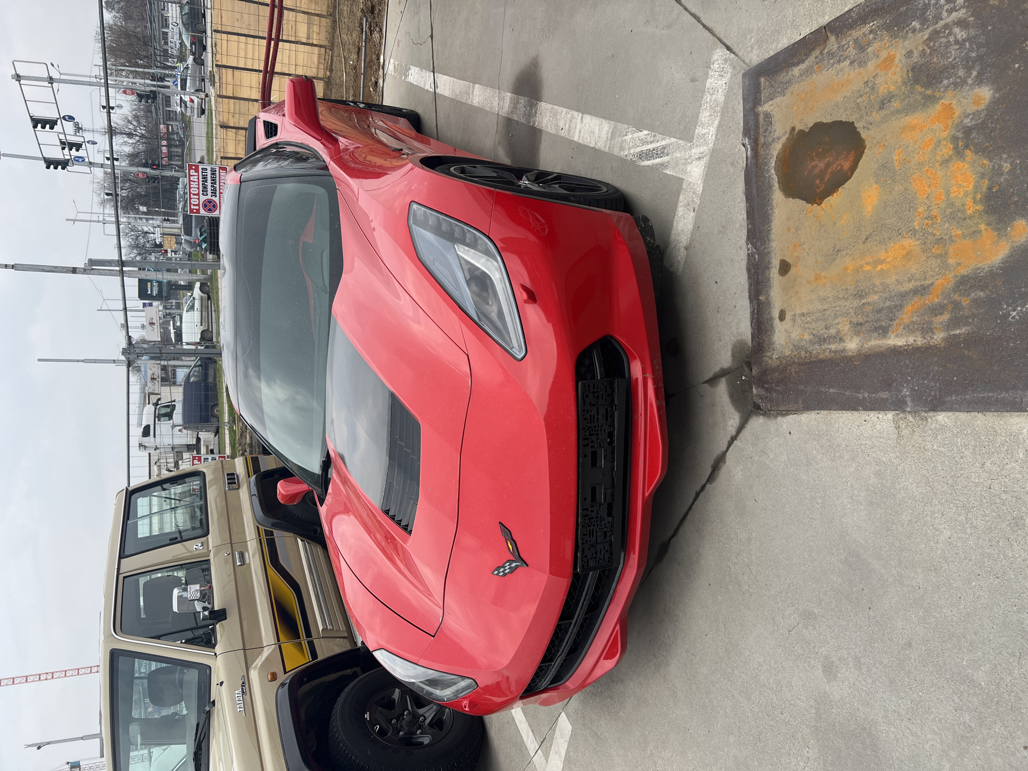 A red Chevrolet Corvette C7 Stingray sports car with a black roof and hood stripe is parked facing forward in a concrete parking space. To its immediate left, the front-left portion of a tan Toyota Land Cruiser (70 series) with black fender flares and a black and yellow side stripe is visible. The concrete ground exhibits faded white parking lines and a square, rusty metal grate containing a small puddle and surrounding rust stains, positioned to the right of the Corvette's front bumper. In the background, a white sign with a red border and a central 'no parking' symbol displays the Bulgarian text "ГОТОКАР - СПИРАНЕТО ЗАБРАНЕНО!" (GOTOKAR - PARKING FORBIDDEN!). Beyond the sign, an urban intersection features multiple traffic lights mounted on an overhead gantry, with other vehicles present on the roadway. Construction cranes are visible in the distant background to the left, and orange plastic construction barriers are situated to the right. The sky is uniformly overcast. No individuals are present. This scene is located at bul. "Osvobozhdenie" 1, Plovdiv, Bulgaria, in an urban environment near the Auto Service Gotokar.