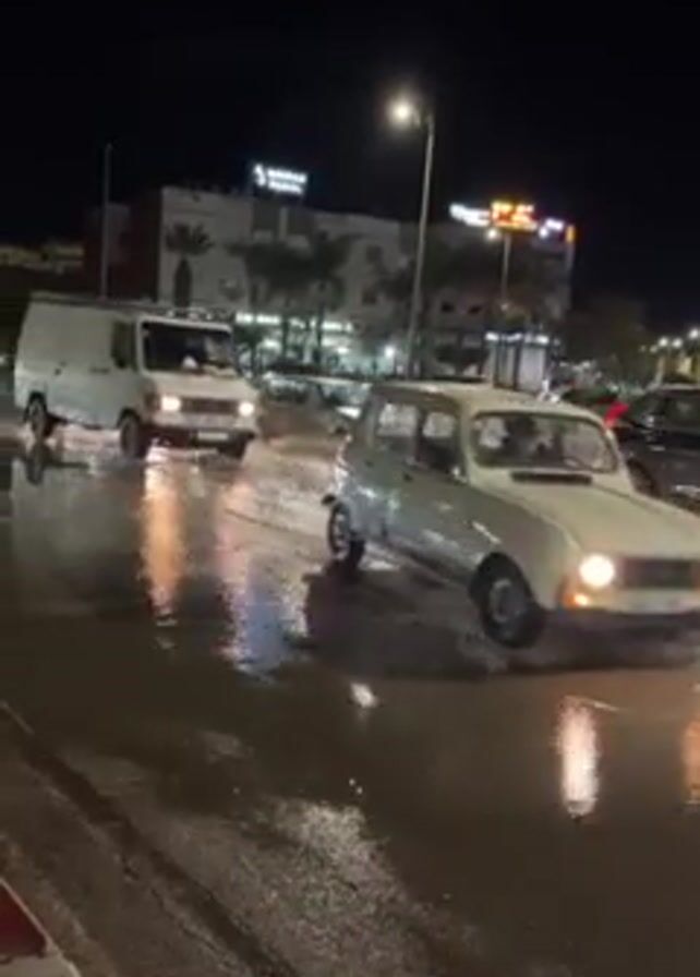 At night, on a flooded street, traffic navigates through standing water. A white Renault 4 drives past the camera, followed by a white van. Other vehicles also proceed cautiously, creating splashes. Streetlights and building lights illuminate the scene. The road surface is wet and reflective, with signs of the flood apparent along the roadside. The background shows a city with commercial buildings and palm trees.
