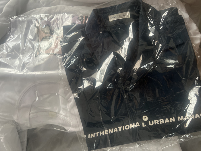 In Rumuofa, Nigeria, two items of new clothing, individually sealed in clear plastic packaging, are depicted resting on a light-colored, soft fabric surface, likely bedding. On the left, a white short-sleeved garment, possibly a t-shirt, is visible through its packaging, displaying a partial graphic design with abstract shapes in shades of brown, pink, and white. To the right, a dark, presumably navy blue or black, collared shirt is visible, also sealed in clear plastic. This shirt features a prominent white button near its lower edge and partial white text reading "THE INTNATIONAL URBAN MANAGEM". A white brand label bearing "Richer Rags & Rags" is visible near the collar area of the dark shirt. No individuals are present, and no active interactions are occurring in the scene.