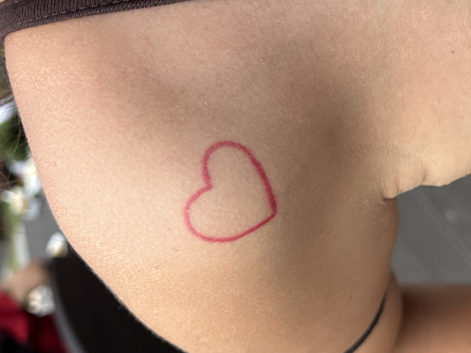 The image presents a close-up, angled forensic view of a light-toned human upper arm or shoulder, situated in Wanagiri, Indonesia. A distinct, hand-drawn outline of a heart, rendered in red, is centrally marked on the skin. A dark brown or black garment strap is visible along the upper right edge of the frame, and a thin black band is present on the lower left. The background is heavily blurred, revealing indistinct shapes and colors consistent with other individuals and furniture, such as tables with light-colored objects (possibly ceramicware), implying a social or leisure environment, likely outdoors or semi-outdoors, under daylight conditions.