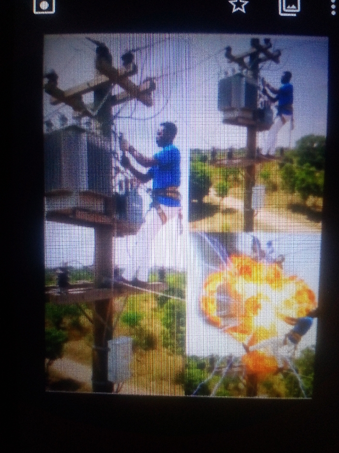This composite image depicts multiple scenes related to electrical utility work, culminating in an electrical incident, situated in Television, Nigeria
