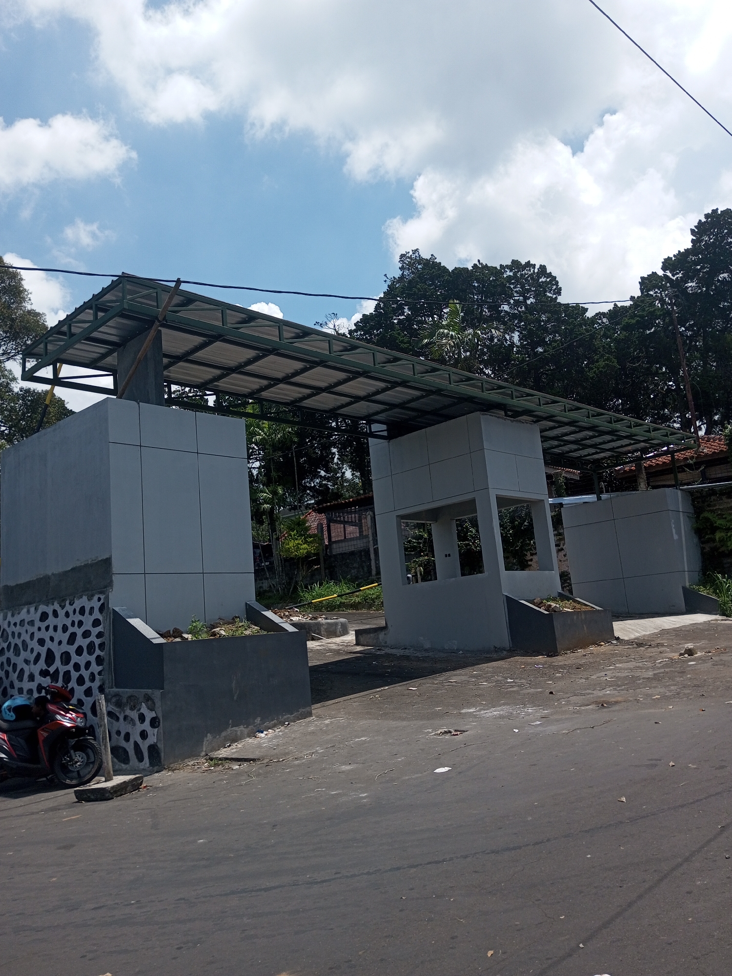 The image depicts a newly constructed or renovated entrance structure, possibly for a residential area or public space. The structure consists of gray concrete pillars and walls, connected by a metal roof frame. The pillars have small planters at their bases. One of the pillars has an open section with windows, suggesting it could be a guardhouse or checkpoint. A red motorcycle is parked near one of the pillars. The road surface in front of the structure is asphalt and appears to be well-used. The background features trees, vegetation, and possibly some residential buildings. The location is unknown and there is no basis to assume it is Kioumaknao 2, Laos.