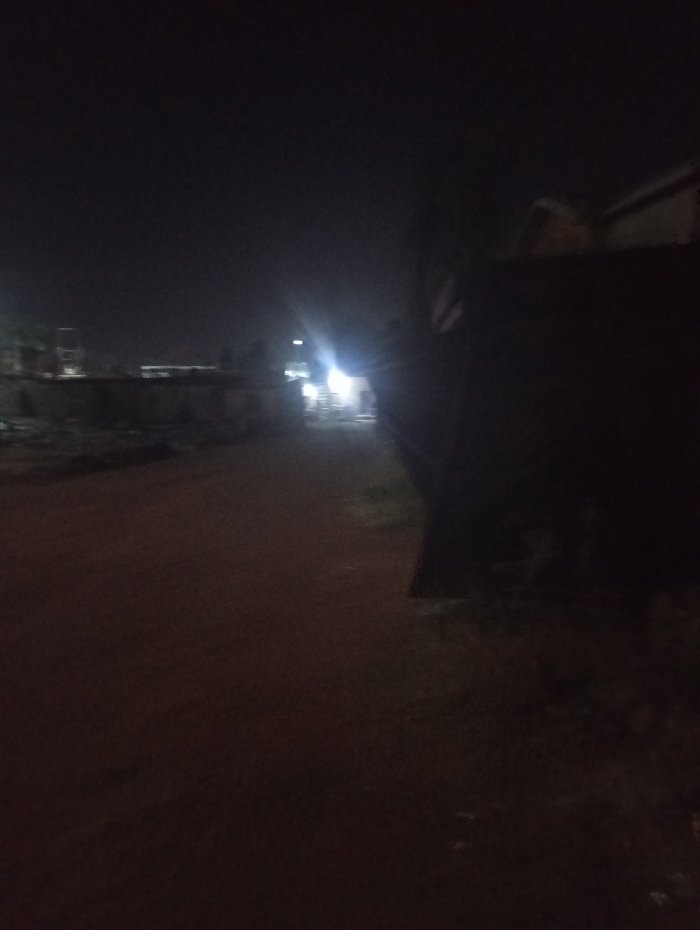 A dimly lit, possibly nighttime, scene shows a dirt road leading away from the viewer towards a distant light source. Dark shapes loom on either side of the road, partially obscuring the view. A wall-like structure is visible in the background on the left. The overall impression is of a desolate and underlit environment.
