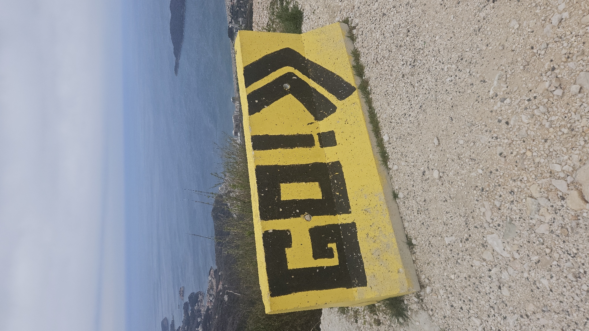 The image presents a close-up view of a yellow concrete signpost, possibly a trail marker, with black directional symbols and text. The text appears to be the abbreviation "G.IJ." The sign is positioned on a surface of light-colored gravel or small stones, with patches of green vegetation visible around its base. In the background, a seascape is partially visible, featuring blue water, coastal land formations, and the distant skyline of a town or settlement. The image suggests a location in Brajici, Montenegro, based on the coastal geography and the presence of a trail marker.
