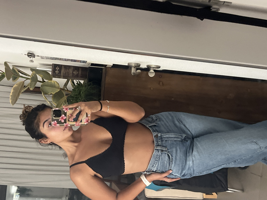 A female subject is depicted in an indoor setting, taking a mirror selfie in what is identified as Raanana, Israel. She is seen from the chest down, angled slightly towards the camera. The subject has dark hair tied in a bun and is wearing a black bralette with scalloped edges and light blue, high-waisted jeans. A white Apple Watch is visible on her left wrist, and multiple rings are on her right hand, along with a thin silver bracelet on her right wrist. She is holding a smartphone, encased in a clear cover with a pink floral design, obscuring her lower face. The background includes a light-colored curtain on the left. To the right of the subject, a tall potted plant with large, glossy green leaves is visible, along with a dark wooden cabinet or chest on which several decorative items, resembling stacked antique books, are placed. A white door frame with a silver door handle and lock mechanism is present on the far right. The overall lighting suggests an indoor environment.