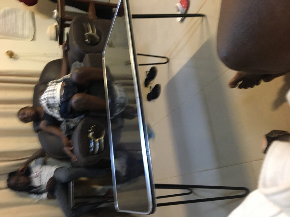 A mirrored image captures a man in a chair, wearing a checkered shirt and shorts, and another man lying down in a white shirt and gray pants. A black metal coat rack stands nearby, with shoes on the floor beneath. The reflection also shows a bare leg and feet, partially obscured. A white garment is also visible in the foreground. The reflection's perspective creates a disorienting effect.