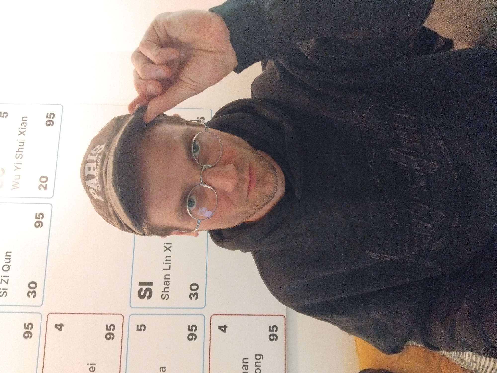 A male individual, approximately 25-45 years old, with light brown hair and facial stubble, gazes directly into the camera. He wears round, wire-rimmed spectacles, a dark grey or black hooded sweatshirt featuring an indistinct embossed logo, and a dark baseball cap with "PARIS" and "BALENCIAGA" text in lighter font. His right hand grasps the brim of the cap. The background consists of a brightly lit white wall adorned with a grid-like chart. This chart displays various Chinese tea names such as "Si Zi Qun," "Wu Yi Shui Xian," and "Shan Lin Xi," accompanied by numerical values like "95," "30," "20," "4," and "5," set within bordered rectangles. A warm-toned, textured surface is partially visible in the lower left. This setting is identified as the Teakop tea shop, located at Vuka Karadžića 7, 11000 Belgrade, Serbia.