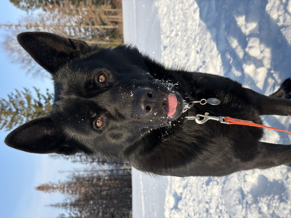 - "A black dog, possibly a German Shepherd type, stands centered in a snow-covered field under a clear blue sky in Ольховка, Russia" by FM-kDhAx1, licensed under CC BY 4.0