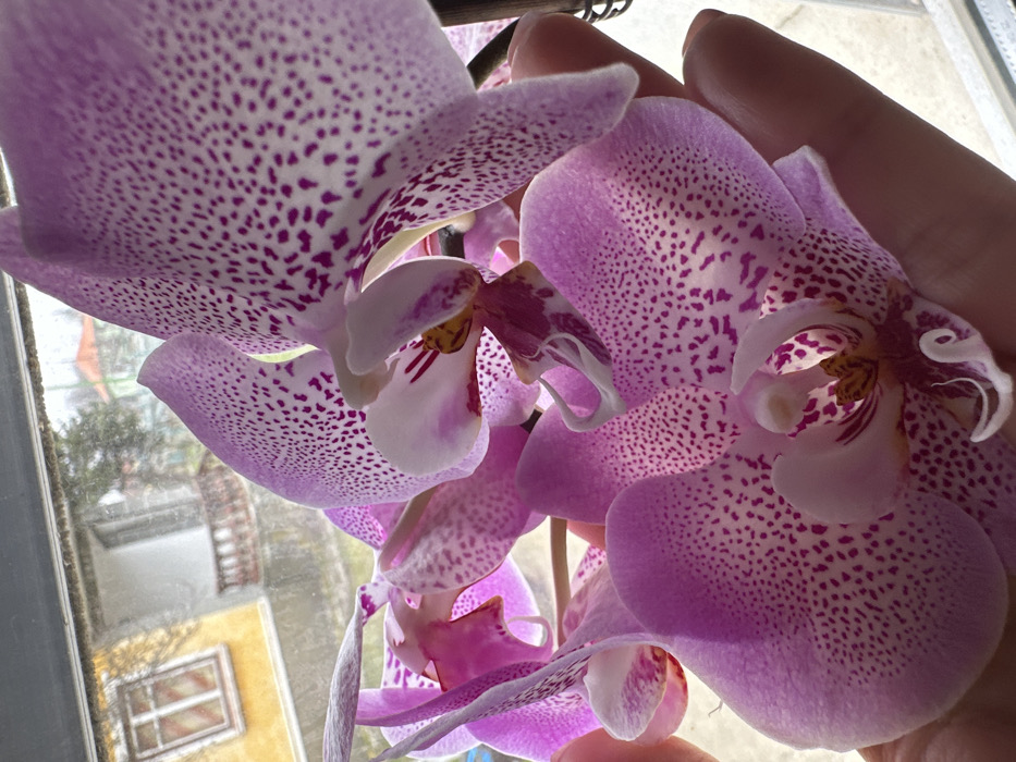 A close-up photograph displays several pink and white orchid flowers, each petal distinctly marked with numerous purple speckles. A human hand is partially visible in the lower right quadrant, gently supporting some of the orchid blooms. The flowers are situated indoors in front of a window. Through the window, an outdoor scene in Bregovo, Bulgaria, is discernible, appearing slightly out of focus. A two-story building with a yellow facade and a white-framed window on its upper floor is visible. Below this window, a balcony with a reddish-brown railing extends. Further in the background, another structure with a red-tiled roof and sparse vegetation are present under an overcast sky.