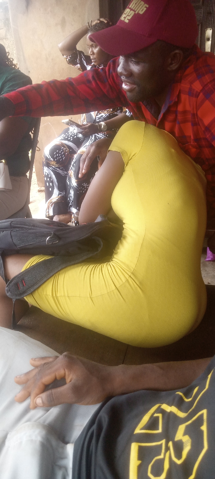 The image displays a group of individuals in Akokwa, Nigeria, within what appears to be an indoor or covered outdoor setting with a light brown wall in the background. In the mid-ground, a dark-skinned male wears a red and black plaid long-sleeved shirt and a maroon baseball cap with "RING 22" in gold text; he is viewed in profile, looking left with an open mouth, his left arm extended. Behind him, a dark-skinned female, wearing a black and white patterned dress, has her right hand near her head and holds a smartphone in her left hand, which displays several thin gold bracelets and a gold-colored watch on her wrists. To the right and in front of the man, a dark-skinned individual is seated, largely obscured, wearing a fitted bright yellow short-sleeved dress. A black bag with a shoulder strap rests across this person's lap. In the immediate foreground, a dark-skinned hand belonging to another seated individual rests on light-colored fabric, with a partial view of a dark t-shirt with a yellow graphic visible on their right side. A person wearing a green shirt is partially visible on the far left.