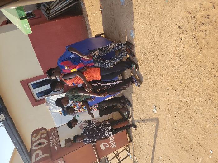 A group of six young men is gathered outside a building with "POS" and "Airtel" signage. They are dressed in casual clothing, including sports jerseys and patterned shirts. The setting appears to be an outdoor space with a sandy or dusty ground. The building has a red and beige exterior, with a window visible in the background. The photograph is taken during the day, with clear lighting.