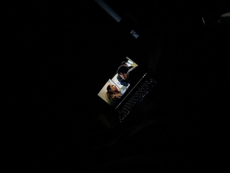 The scene displays a laptop operating in a dark indoor environment