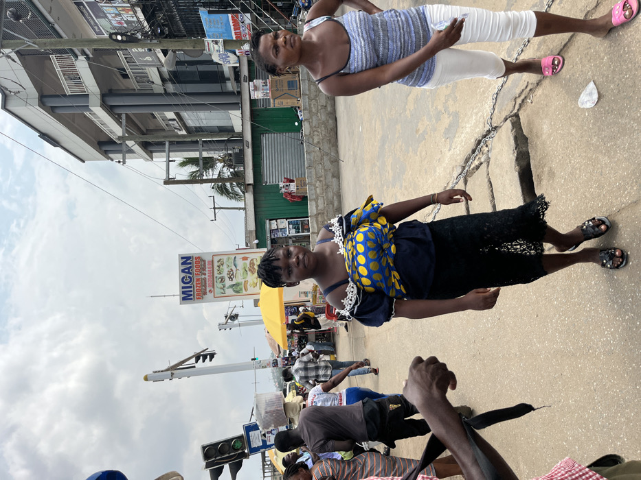 This image captures a street scene in Ablekuma, Ghana, under an overcast sky. In the immediate foreground, the left side shows a partial view of a person's arm and hand, holding a black strap. In the center, a dark-skinned woman with dark braided hair stands facing forward, wearing a navy blue off-shoulder top with white lace trim, a blue and yellow polka-dotted fabric wrapped across her chest, a black knee-length lace skirt, and black flat sandals. To her right, a second dark-skinned woman stands, facing slightly right, wearing a light blue and white striped tank top, white capri pants, and pink open-toed sandals. She holds a small white object in her right hand. On the ground near her feet is a piece of white debris. In the midground, to the left, a crowd of pedestrians moves, including one individual carrying a large white object on their head. A yellow market umbrella is visible over a stall area. To the center-right, a prominent vertical sign displays "MIGAN FROZEN FOODS" with images of various food items and a phone number (0535844888). Below this sign is a single-story green building with a closed roller shutter. Further in the background, a multi-story grey building with dark architectural pillars is visible, along with multiple utility poles and overhead power lines. Traffic lights are present on the left, with the bottom light illuminated green. The ground consists of paved asphalt with a visible drain or gutter covered by a metal chain running horizontally across the midground.