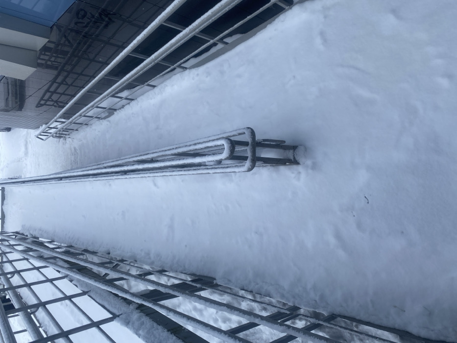 A snowy landscape shows metal structures, including grates and pipes, partially buried. The thick snow cover obscures the ground beneath. A building with reflective windows is visible at the top. The perspective suggests a high vantage point looking down onto the snow-covered area. The scene evokes a sense of winter's heavy presence.
