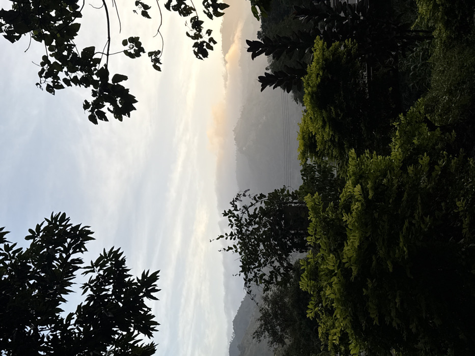 A hazy landscape framed by foliage fills the image. The sky, streaked with white and pale yellow, hints at dawn or dusk. Rolling hills fade into the distance, their outlines softened by mist. Dark silhouettes of tree branches and leaves occupy the foreground, creating a sense of depth. Lush green vegetation covers the right side of the frame, contrasting with the muted tones of the distant hills. A sense of tranquility pervades the scene.